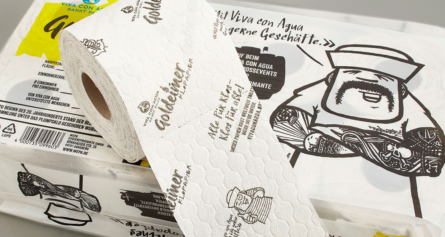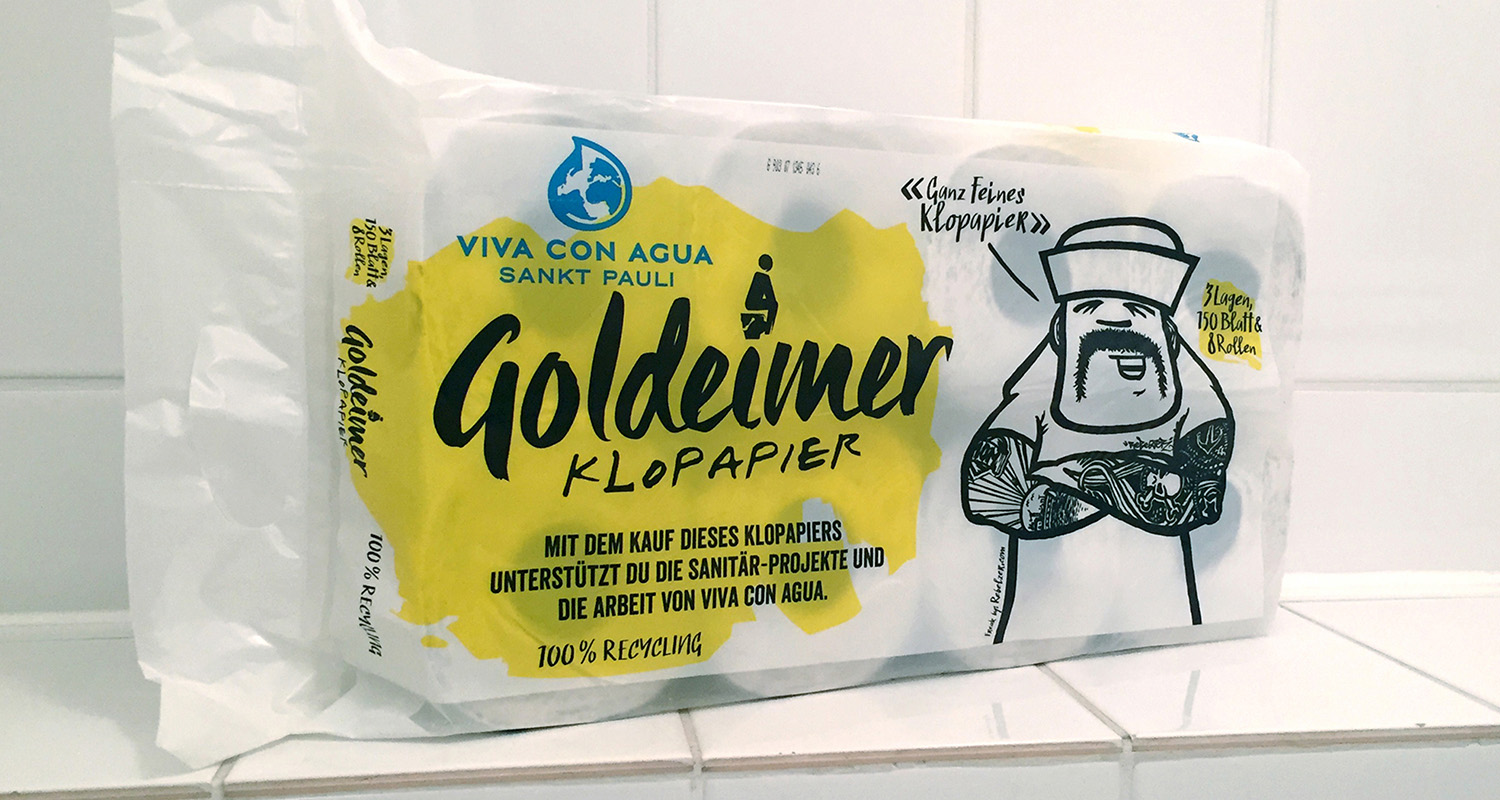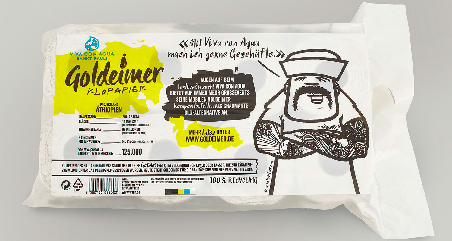 Goldeimer Klopapier ist neben dem Mineralwasser die zweite Projektkomponente in dem Social Business Produktportfolio von VcA. 50% des Verkaufspreises werden an die Sanitärprojekte der Welthungerhilfe gespendet. Für Goldeimer haben wir ein Erscheinungsbild entworfen, das mit allen bekannten Design-Standards in der Kategorie Toilettenpapier bricht und dadurch besondere Aufmerksamkeit am POS erreicht. Ausgezeichnet mit dem European Design Award und German Design Award .