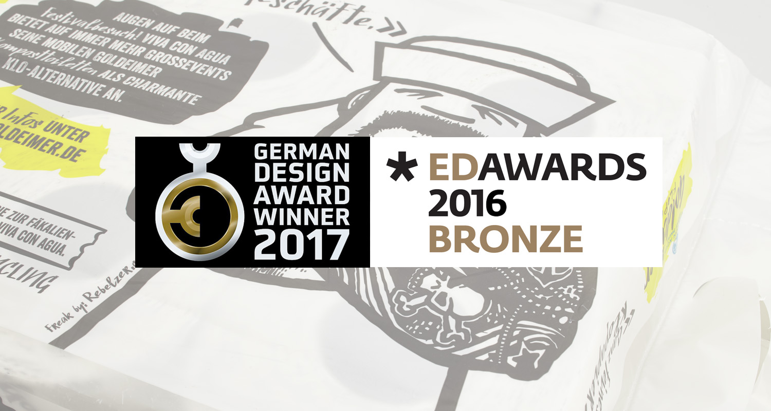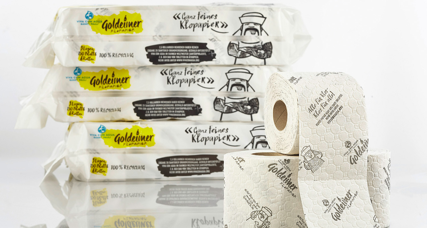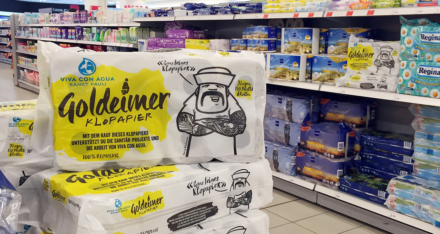 Goldeimer Klopapier ist neben dem Mineralwasser die zweite Projektkomponente in dem Social Business Produktportfolio von VcA. 50% des Verkaufspreises werden an die Sanitärprojekte der Welthungerhilfe gespendet. Für Goldeimer haben wir ein Erscheinungsbild entworfen, das mit allen bekannten Design-Standards in der Kategorie Toilettenpapier bricht und dadurch besondere Aufmerksamkeit am POS erreicht. Ausgezeichnet mit dem European Design Award und German Design Award .