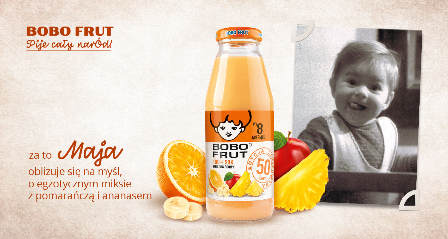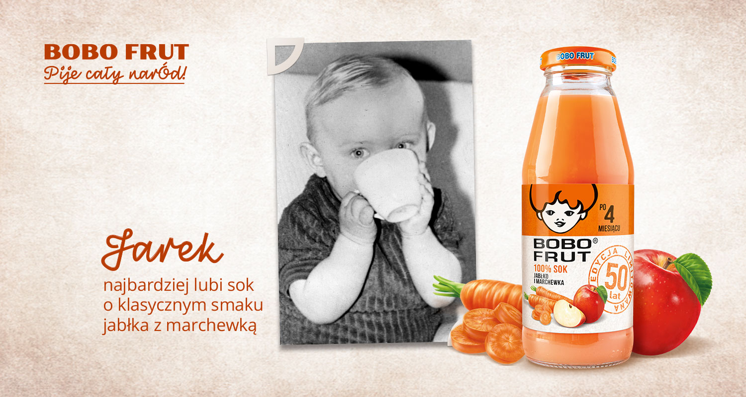 Pierwsze butelki soków Bobo Frut zjechały z linii produkcyjnej w 1968 roku. Od tamtej pory marka zyskała miano kultowej, a wokół zmieniło się wszystko… Dzisiaj, po 50 latach istnienia Bobo Frut wraca do tamtych chwil i zabiera swoich konsumentów w sentymentalną podróż. To wszystko za sprawą historycznej edycji limitowanej, której kreacją mieliśmy przyjemność się zająć. Korzystając z archiwalnych materiałów raster po rastrze odtworzyliśmy pierwsze etykiety soków. Ale to nie wszystko. Naszym celem było stworzenie layoutu hybrydowego. Uzupełniliśmy więc klasyczny design nowoczesnymi wizualizacjami co zaowocowało spotkaniem przeszłości i teraźniejszości na jednej, wspólnej etykiecie.