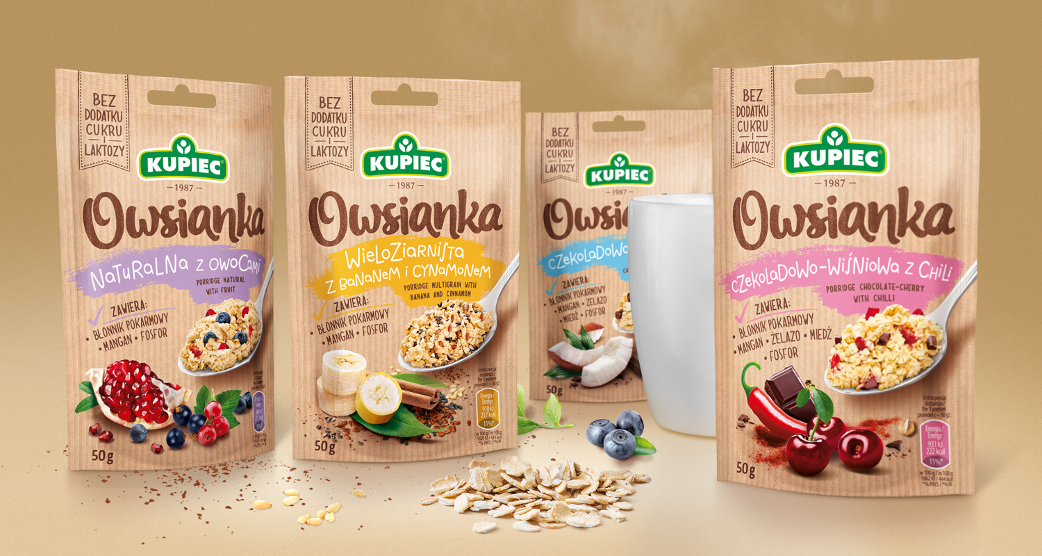 Zdrowa radość życia to nasz codzienny wybór. Wybór świadomy, ponieważ tworzymy nasze produkty w trosce o zdrowie, dobre samopoczucie oraz przyjemność smaku, był naszym punktem wyjścia do opracowania designu opakowań, od typografii, przez kompozycję po apetyczne wizualizacje. Naszym wyzwaniem było konsekwentne realizowanie strategii poprzez branding i opakowania na szerokim portfolio marki. Wielomiesięczny proces zaowocował nadzorowanym przez nas wdrożeniem. Marka Kupiec dzięki nam stała sięświadoma własnej wartości – umiejętnie komunikuje jakość i doskonale wpisuje się ze swoimi produktami w nowe trendy.