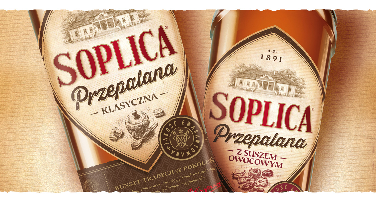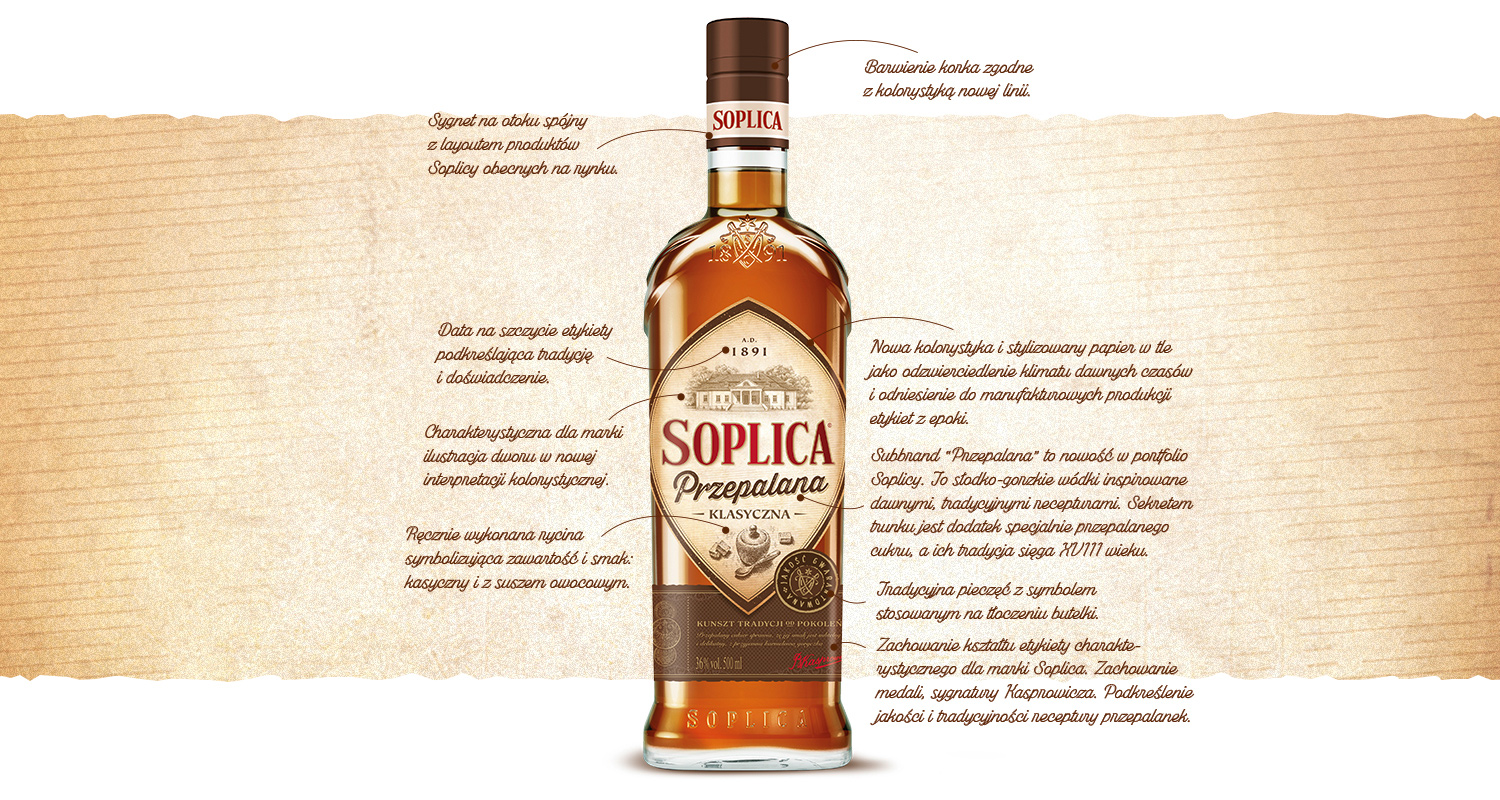 Naszym zadaniem był kompleksowy projekt nowej lini produktów – Soplicy Przepalanej. Jest to trunek inspirowany dawnymi, tradycyjnymi przepisami, których historia sięga XVIII wieku. Sekretem smaku przepalanek było wtedy odpowiednie przepalanie cukru dodawanego do alkoholu. I dokładnie ten czas i proces mięliśmy zaakcentować na opakowaniu.